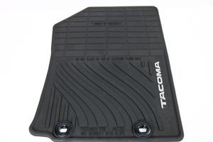 Local mud run? Bring it on and let these all-weather Floor mats catch the mess. Made from an easy to Clean, durable and flexible weather-resistant Material Nibbed backing and quarter-turn fasteners on front Floor mats help keep mats in position Feature ribbed channels and an embossed vehicle Logo? ? Fits Tacoma Color: Black Number of Pieces: 4 This Floor mat was designed specifically for use in your model and model year vehicle and SHOULD NOT be used in any other vehicle. To avoid potential interference with Pedal opeRation, each mat must be secured with its fasteners. Do not install a Floor mat on top of an existing Floor mat. Helps protect vehicle's factory carpet against mud, sand, stains and soils. made form an easy to clean, durable and flexible weather resistant material. Quarter turn fasteners on the driver's side and nibbed backing on all mats help keep mats in position.Black mats feature ribbed channels and an embossed vehicle logo.